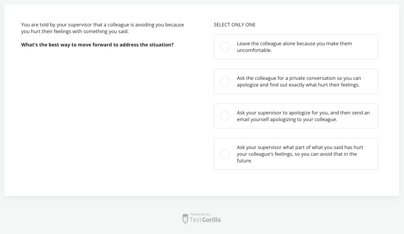 Harver’s situational judgment test also contains questions about workplace communication. Candidates are given challenging video scenarios and are asked to respond.