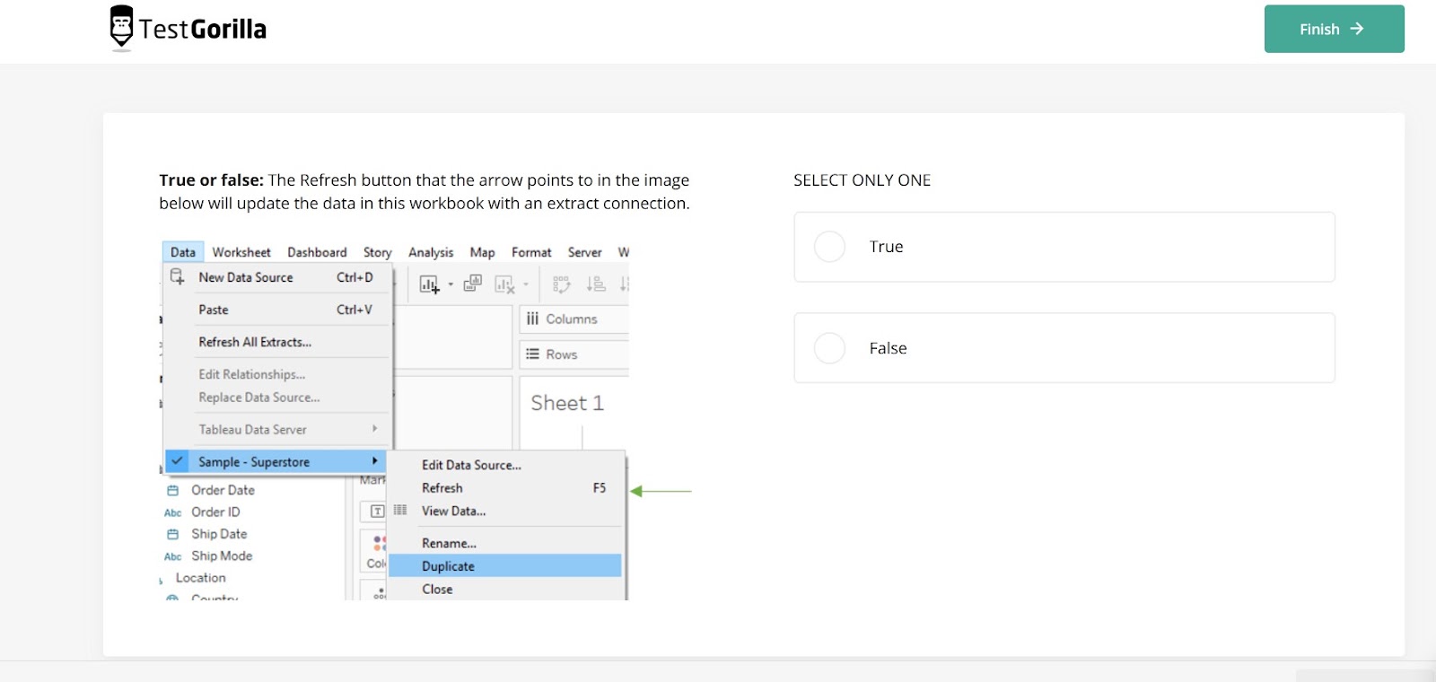Above is a question in the Tableau test regarding updating data in a Tableau workbook, and the one below evaluates whether candidates know how to use a different method in Tableau to get the same result: