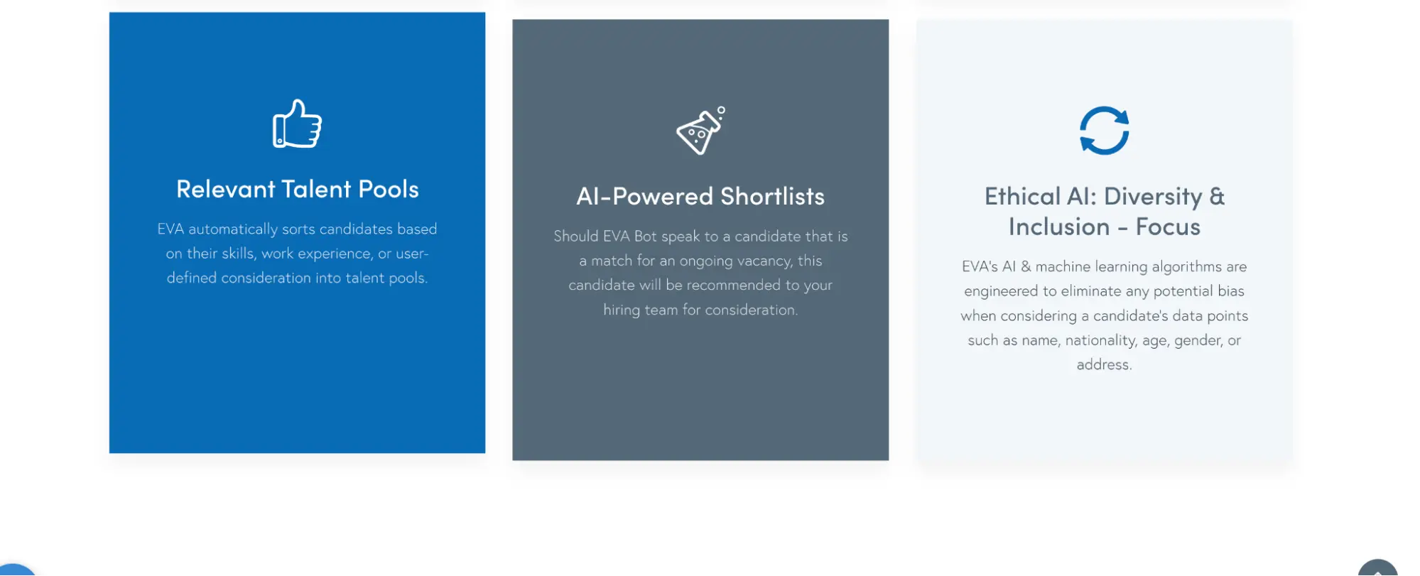 EVA performs basic screening assessments with its automated conversational AI, EVA Bot. It engages candidates in chat-like interactions to gather information and evaluate their fit for roles. EVA also filters candidates as they enter the candidate database and automatically compares their initial assessment against all job postings.