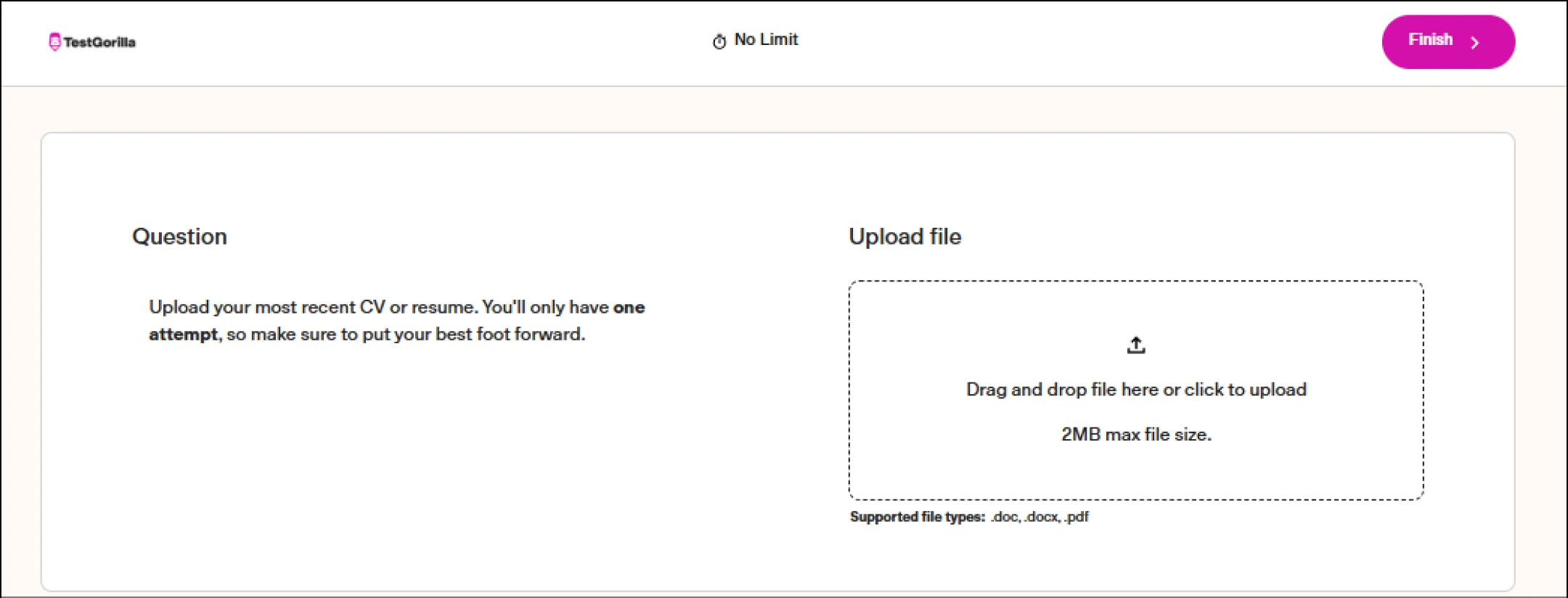 After you’ve chosen your scoring criteria and your resume scoring assessment is live, candidates will be prompted to upload their resumes in standard formats like PDF or a Microsoft Word .docx file.