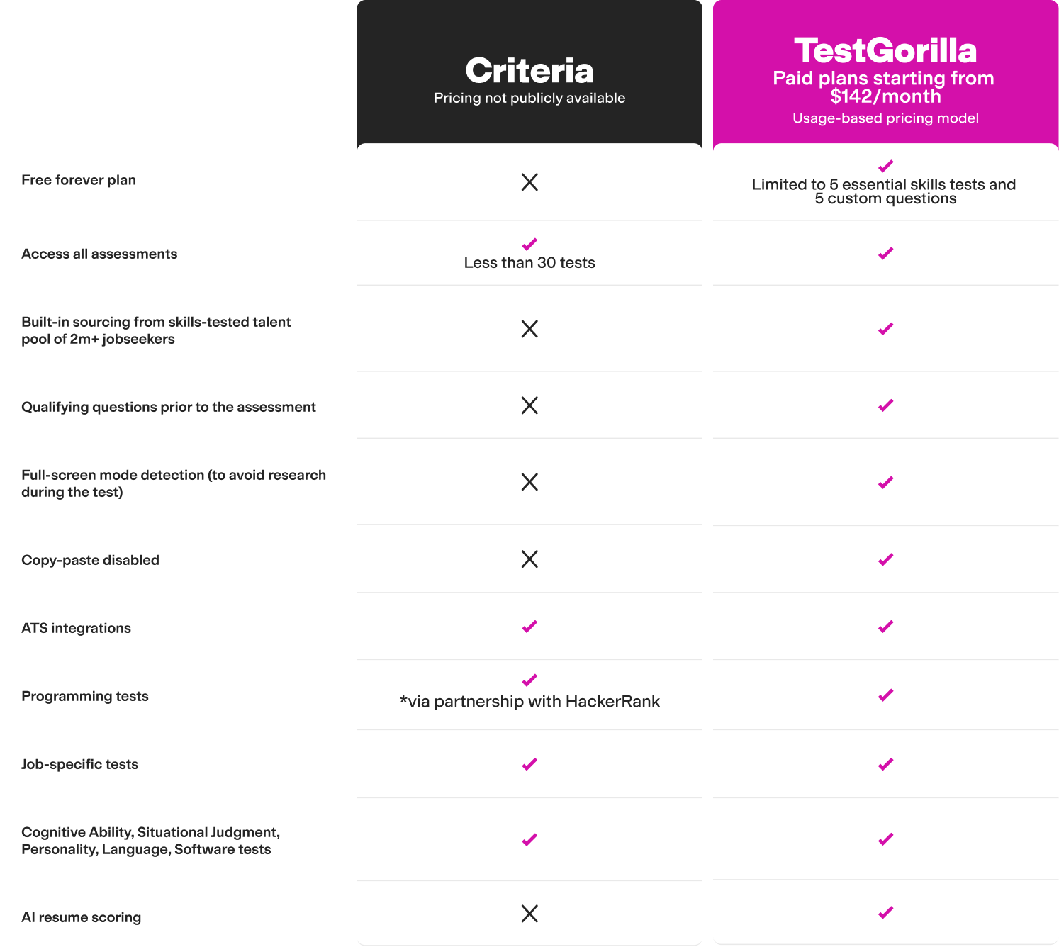 With skills-based sourcing, custom evaluations, and a deep library of validated tests, TestGorilla offers a smarter, more comprehensive alternative to Criteria Corp, all backed by an intuitive platform and award-winning support.