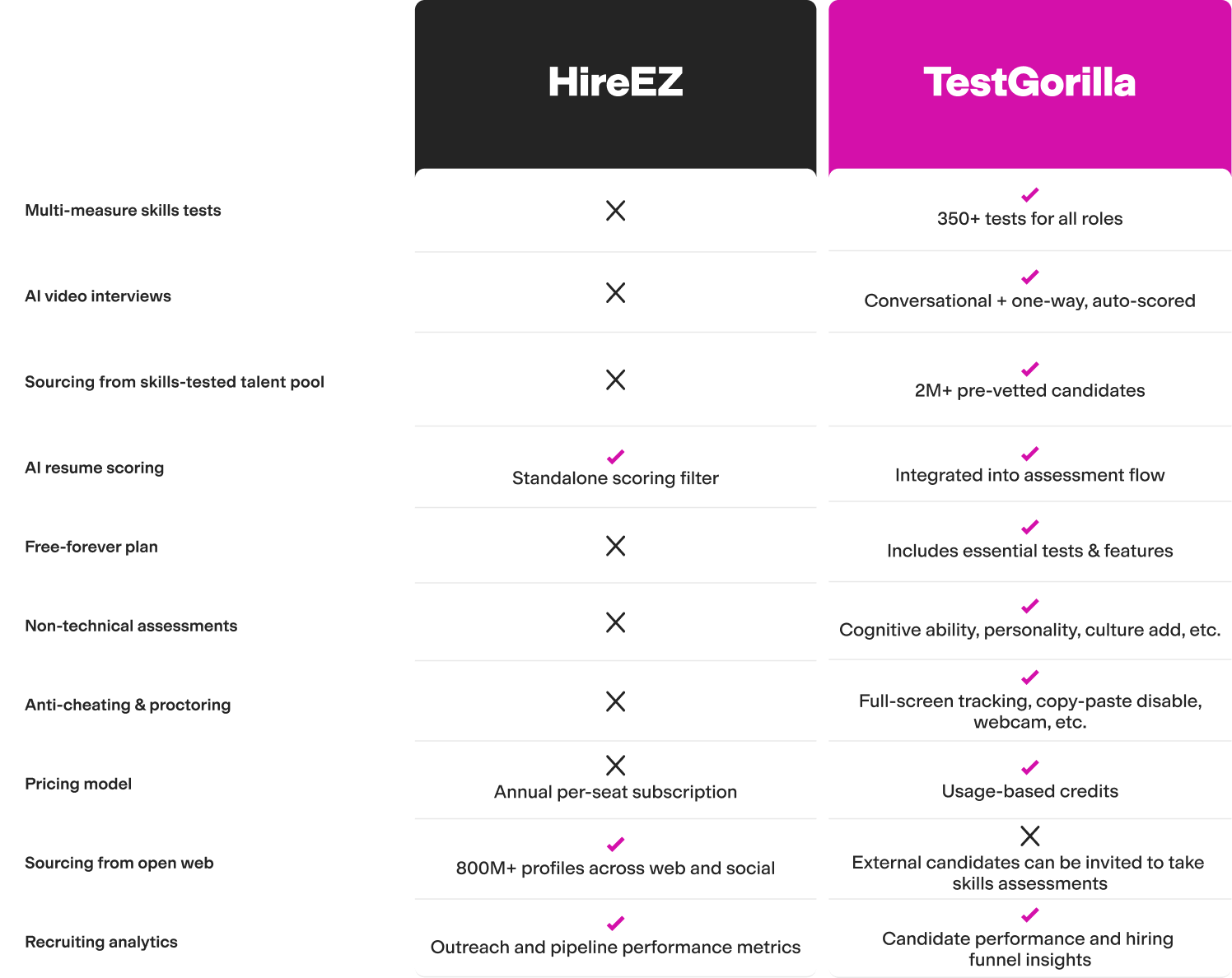 HireEZ sources talent. TestGorilla delivers end-to-end hiring. source from 2M+ pre-vetted candidates, assess with 350+ validated tests, and screen with AI in one skills-based platform. Ready to source, screen, and shortlist in one platform?